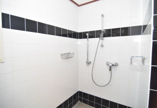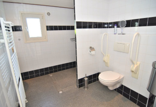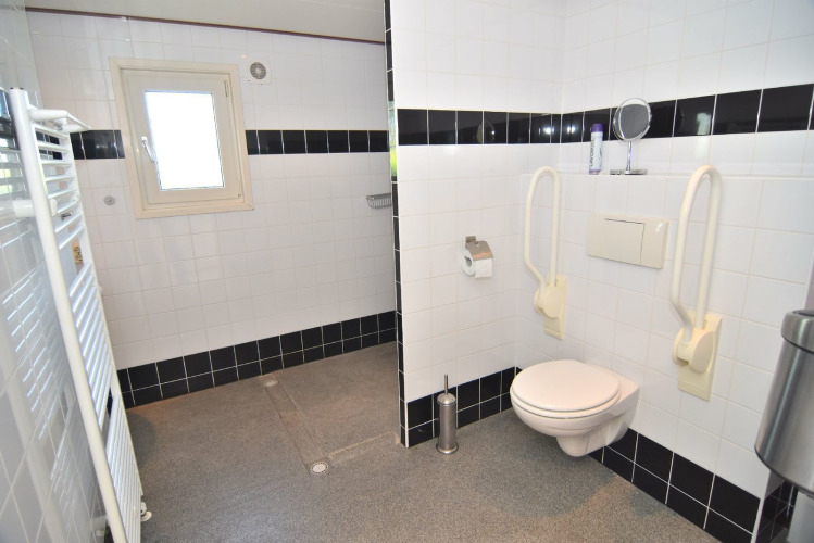 This comfortable chalet is complemented inside by a modern bathroom adapted for people with disabilities, with a wheelchair-accessible shower, a washbasin and a toilet with armrests.