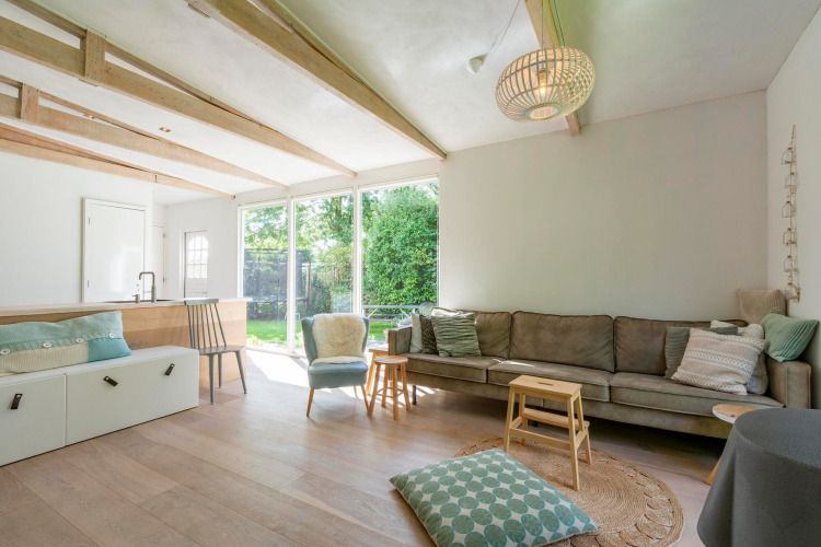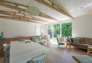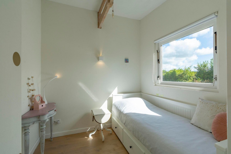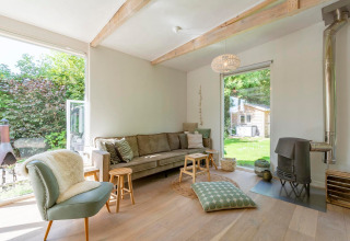 Outside, the sunny garden offers plenty of space to unwind. Spread out over several seating areas, you can enjoy your morning coffee, fire up the barbecue, or simply soak up the fresh air. It’s also a fun playground for younger guests, with a trampoline and a treehouse with swing. There’s a high chair available, and one dog is welcome too – so you don’t have to leave anyone at home.