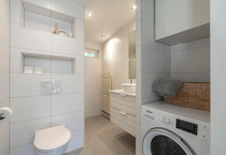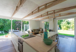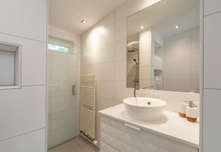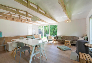 Eureka 109 is a cosy and stylish bungalow that’s made for relaxed getaways with friends. The bright living room is the heart of the house, with a comfortable sofa area around a crackling wood-burning stove – perfect for long chats, game nights, or a quiet drink after a day outside. The fully equipped kitchen has everything you need to cook together, and the spacious dining table invites long dinners and lazy breakfasts.