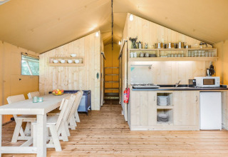The layout Inside, De Bos Tent feels intimate and comfortable, with everything you need for a relaxing stay for up to five people. There is a lovely bedroom with a double bed and a second bedroom with a bunk bed and a single bed, ideal for children or friends. The tent is fully equipped with a stylish bathroom and a generously stocked kitchen, for long evenings at the table, without any rush.
