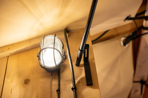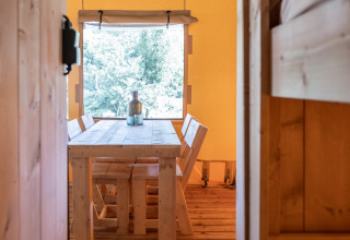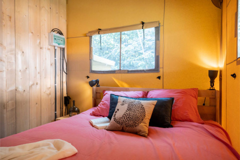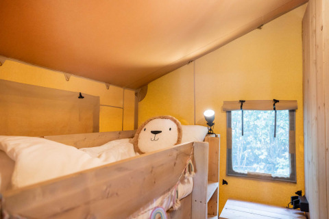 The layout This spacious 4-person glamping tent offers the best of both worlds: the freedom and charm of camping combined with the comfort of a high-quality accommodation. Inside awaits a cozy living area with a bedroom with a double bed and a separate bedroom with a bunk bed, ideal for families or traveling together.