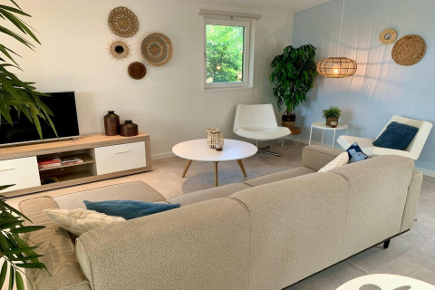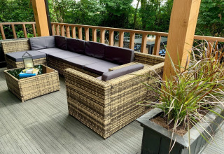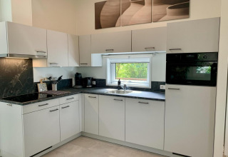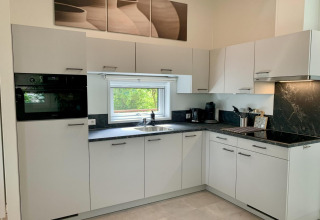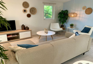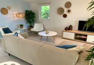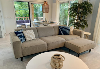 Inside, the living room feels bright and welcoming thanks to the large windows, high ceilings, and natural wood finish. Sink into the comfy sofa or one of the swivel armchairs and watch your favourite series on the Smart TV with Dutch and German channels. The open-plan corner kitchen is fully equipped with an induction hob, combi microwave, dishwasher, and fridge-freezer, so cooking is easy – whether you’re making a quick breakfast or a relaxed family dinner. At the dining table there’s space for five, ideal for long meals and game nights.