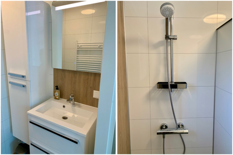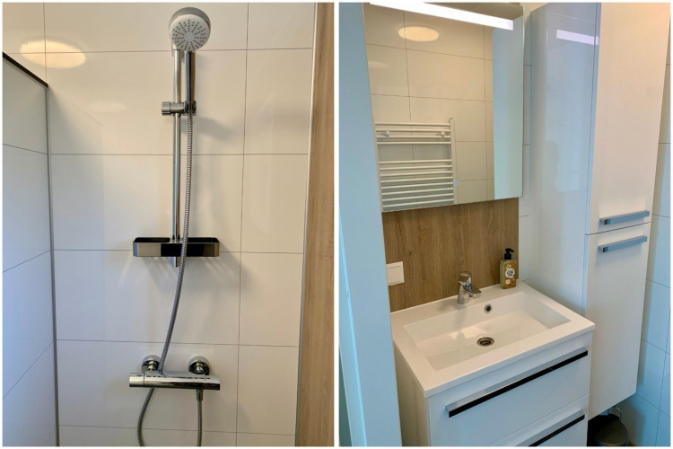 The chalet has two bedrooms: one with a comfortable double box-spring bed, and a second bedroom with a bunk bed plus a single bed – perfect for families or a group of friends. The modern bathroom comes with a walk-in shower and illuminated mirror, and there’s a separate toilet for extra convenience. Thanks to the water softener, the water is kind to your skin and hair – especially nice if you have sensitive skin.