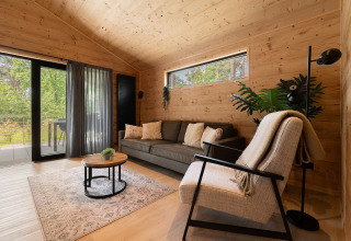 has a cozy interior with lots of wood and is completely single-story. Inside you will find a fully equipped open kitchen and a comfortable living room with a Smart TV. There are two bedrooms and one bathroom. There is also a