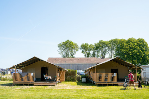 The safari tent with bathroom is a luxury safari tent suitable for up to 4 people, an ideal accommodation for a family or group vacation! With an area of 25m2. Eat together at the large table with chairs, throw open the front of the tent completely and enjoy the view and fresh air. Prepare meals in the full kitchen and unwind at the end of the day on one of the luxurious chairs or in one of the 2 bedrooms. In one bedroom you will find a large double bed, and in the other you will find one bunk bed. At 2 meters long, the beds are suitable for both children and adults. To make your glamping vacation even more luxurious, the safari tent is equipped with a full bathroom with a shower, toilet and sink.