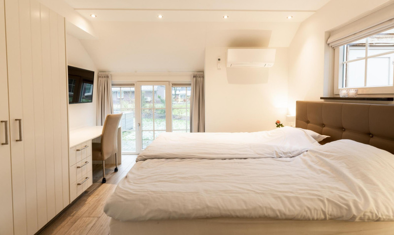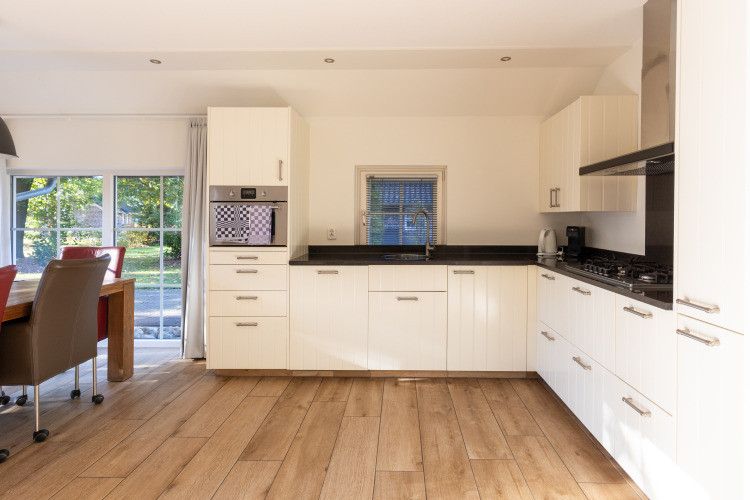 Ground floor Entrance with separate toilet. The spacious living room is furnished with a flatscreen TV, gas fireplace, underfloor heating, and French doors leading to the terrace. On the terrace there is a luxury garden set with a parasol where you can peacefully enjoy the spacious, green plot. Furthermore, there is a luxury open kitchen with a hob (5 burners and a wok burner), dishwasher, Illy espresso machine, combi-oven, and a fridge with separate freezer. On the ground floor, there is also a bedroom with a double bed and an en-suite bathroom with rain shower, Sunshower, and sink.