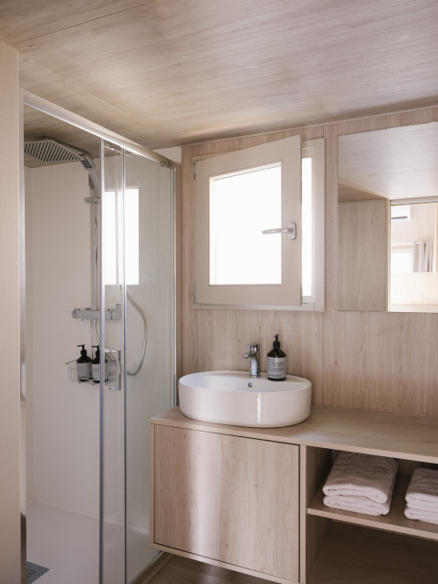 Just like a hotel, but even better: air conditioning, a private bathroom with a hair dryer, toiletries, towels, bed linen, and a cleaning set. In addition, it has a furnished 7 m² terrace to enjoy the outdoors.