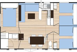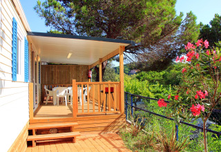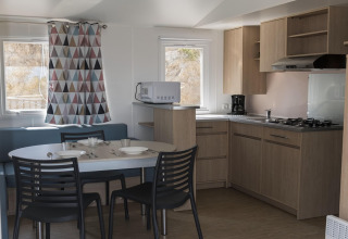 Inside, you’ll find a cosy living-dining area with a flat-screen satellite TV, plus a fully equipped kitchenette with hob, fridge and microwave – perfect for breakfasts together or a simple meal after a day in the sun. The private bathroom keeps things practical, and depending on the location of your mobile home, you can enjoy views of the sea or the surrounding mountains.