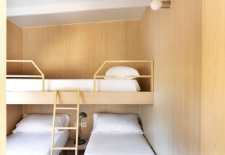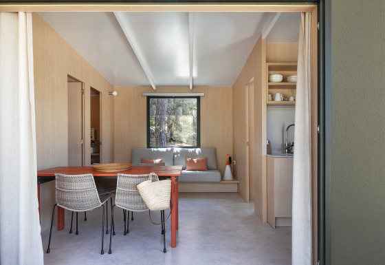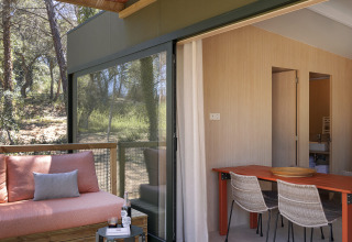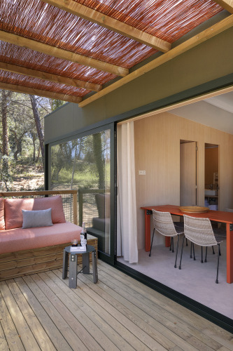 The Mobil Home Family+ are designed to offer you more space and comfort during your holiday. They accommodate up to 5 people and feature two bedrooms (one with a double bed and one with three single beds), a fully equipped kitchen, a bathroom with shower, and a terrace with a covered seating area to enjoy the outdoors. And best of all: they also accept dogs!