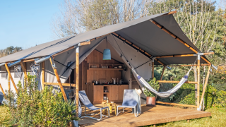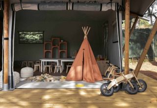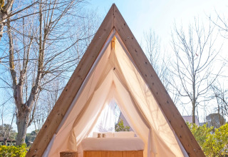 The Bell Tent features a comfortable double bed, made for you upon arrival, and towels are also included. There is no kitchen, but there is a coffee maker compatible with Nespresso® capsules, a mini fridge, kitchen utensils, tableware, and a microwave. The tent does not have its own bathroom, but the public restrooms are just a few meters from the tent. Enjoy a self-made cup of coffee in the morning sun on your private terrace.