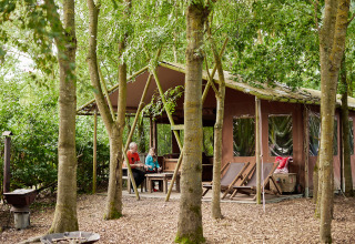 The tent house offers everything you need for a relaxing stay. Inside you will find a spacious living area with a cozy sofa and a large dining table where you can gather with the whole family or friends. Do you hesitate between inside or outside? On the porch, you'll be sheltered under the awning, with a picnic table and lounge chairs for relaxing. Outside, enjoy a hot tub!