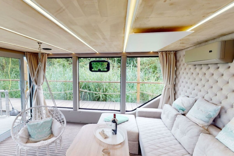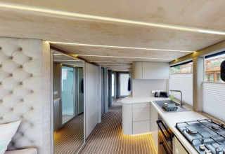 En el interior, encontrarás una sala de estar luminosa y aireada, con grandes ventanales que dejan entrar mucha luz natural y ofrecen vistas relajantes al puerto. Los colores suaves, los materiales de alta calidad y los detalles cuidadosamente seleccionados crean un ambiente cálido y relajado en el que te sentirás como en casa de inmediato. Dos dormitorios independientes aseguran privacidad y noches tranquilas, haciendo de este hogar vacacional flotante una opción ideal para parejas, amigos o una pequeña familia que viaja junta.