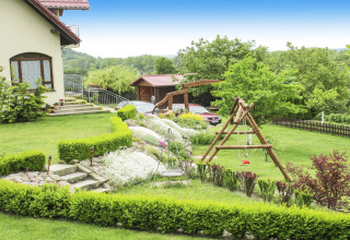 En el exterior realmente puedes disfrutar del aire fresco. Delante de la casa hay una terraza cubierta donde puedes desayunar, leer un libro o ver la puesta de sol sobre el lago. A un lado encontrarás una barbacoa, un cenador y una pequeña zona de juegos; perfecto si viajas con niños a los que les gusta correr de manera segura mientras te relajas con una bebida.