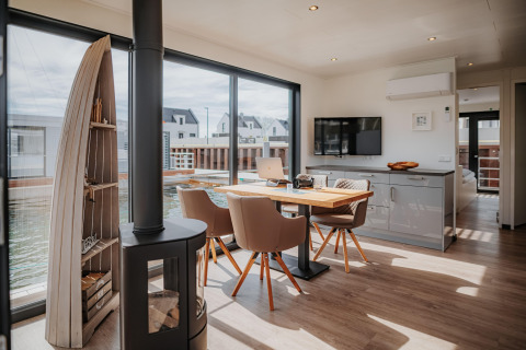 La cocina abierta está totalmente equipada, así que cocinar a bordo es fácil. Encontrarás una placa vitrocerámica, un mini horno, lavavajillas y un frigorífico-congelador: ideal para desayunos tranquilos, picoteos entre actividades o una cena sencilla con vistas. También hay dos baños en la casa flotante, lo que hace que compartir el espacio con amigos o familia sea mucho más cómodo.