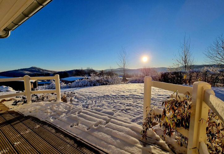Desde el salón, las puertas francesas ofrecen acceso directo a la terraza cubierta, que desemboca en el hermoso jardín con deslumbrantes vistas de las montañas de Sauerland.