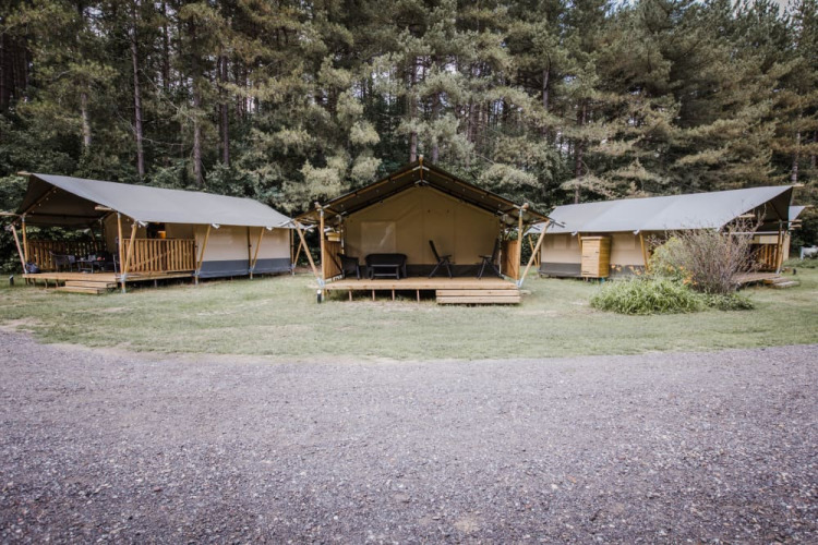 En el camping glamping, en medio del bosque, podrás disfrutar de tus vacaciones en una tienda safari para 4 personas con instalaciones sanitarias incluidas.