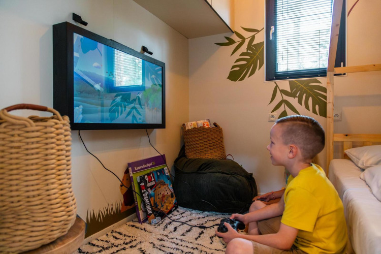 El chalé infantil 2+2 es un chalé de planta baja, adecuado para 2 adultos y 2 niños. El chalet está especialmente equipado para los niños. El salón tiene una zona de estar con televisión, una zona de comedor y una amplia cocina. Los niños se entretienen con la Nintendo Switch que se encuentra en la habitación infantil con dos camas de 1,60 m (adecuada para niños de hasta 8 años). La habitación es muy adecuada para niños pequeños. También hay otro dormitorio doble y un cuarto de baño con ducha, lavabo e inodoro. En la casa de vacaciones puedes aparcar 1 coche y puedes usar wifi gratis.