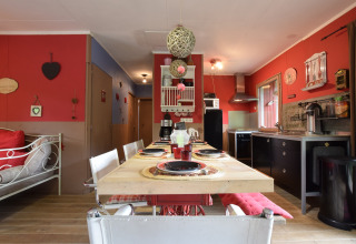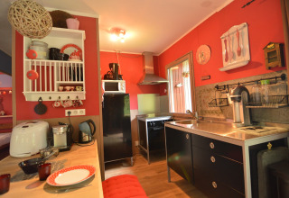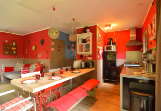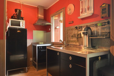 En el interior, el ambiente es cálido y acogedor. La sala de estar es el lugar natural de reunión: relájate en el sofá, mirad la televisión juntos o planead la aventura de mañana. La cocina completamente equipada hace que sea fácil preparar tus propias comidas, desde un desayuno sencillo antes de una larga caminata hasta una gran cena para todo el grupo.