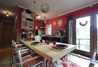 Hay 2 dormitorios y espacio para hasta 7 huéspedes, por lo que funciona bien para un grupo de amigos o dos parejas con algunos compañeros de viaje extra. El chalet también es apto para niños: hay una silla alta disponible para el pequeño del grupo, así que todos pueden sentarse a la mesa sin complicaciones.