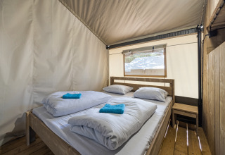 Esta espaciosa safaritent de 47 m² combina la auténtica sensación de acampada con el confort moderno. En el interior encontrarás una acogedora sala de estar con mesa de comedor, zona de estar y una cocina totalmente equipada con, entre otros, una cocina de 4 fuegos, nevera con congelador, microondas, cafetera y hervidor de agua. La tienda dispone de su propio baño con ducha, inodoro y lavabo, lo que proporciona una comodidad adicional durante tu estancia. Gracias al aire acondicionado, el interior se mantiene agradable incluso en los días calurosos.