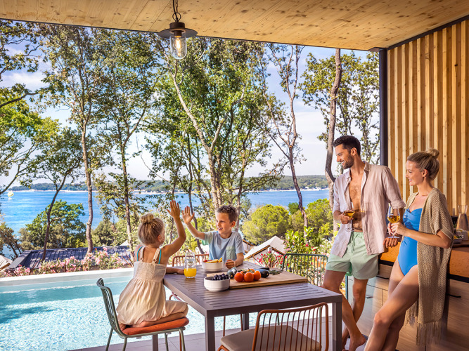 Valamar Camping Istra en Funtana, Croacia ofrece una experiencia de glamping premium rodeada de las impresionantes vistas al mar Adriático y bosques mediterráneos. Aquí disfrutarás de elegantes tiendas glamping y casas móviles con piscinas privadas o terrazas, combinando a la perfección comodidad y naturaleza. El parque es ideal para familias: los niños se divertirán en el impresionante parque acuático con emocionantes toboganes, piscinas infantiles dedicadas y zonas de juegos acuáticos, mientras que los adultos pueden relajarse en zonas de bienestar o practicar yoga junto al mar. El restaurante del lugar, el mini-mercado y la plaza central aseguran que tengas todo a mano para unas vacaciones relajantes. Con acceso directo a una playa de Bandera Azul, parcelas de glamping bien cuidadas y una amplia gama de deportes, entretenimiento y servicios que admiten mascotas, Valamar Istra es el lugar perfecto para una escapada lujosa y despreocupada al aire libre.
