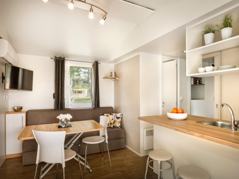 Entra y déjate sorprender por un interior luminoso y acogedor, con elegantes detalles en madera y mobiliario contemporáneo. El espacio de estar con aire acondicionado cuenta con un cómodo sofá y un comedor con capacidad para seis personas, que se conecta perfectamente con una cocina totalmente equipada. Prepara deliciosas comidas fácilmente usando el microondas, hervidor de agua, cafetera, frigorífico-congelador y placa. La distribución abierta, los grandes ventanales y las puertas correderas de cristal llenan la casa de luz natural, creando una sensación de amplitud.