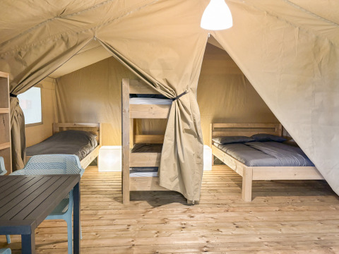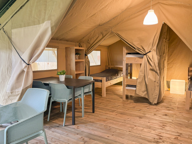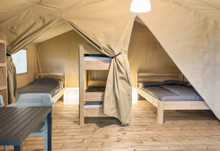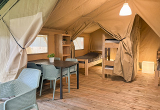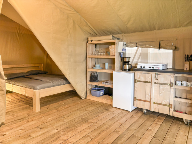 Siente el encanto de la vida al aire libre en esta acogedora Safaritent, donde el confort y la naturaleza se unen. Comienza el día con una taza de café en la terraza bajo el toldo y escucha el suave murmullo del entorno. La cocina totalmente equipada, con nevera, cafetera y cocina de gas de cuatro fuegos que se puede trasladar fácilmente al exterior, hace que cocinar al aire libre sea una fiesta. En el interior, dos acogedoras cabinas de dormitorio ofrecen espacio para todo el grupo: una con cama doble y otra con una cama individual y una litera. Las mantas y almohadas ya están listas, por lo que nada obstaculiza un sueño relajante. Un lugar ideal para quienes disfrutan del confort con un toque de aventura.