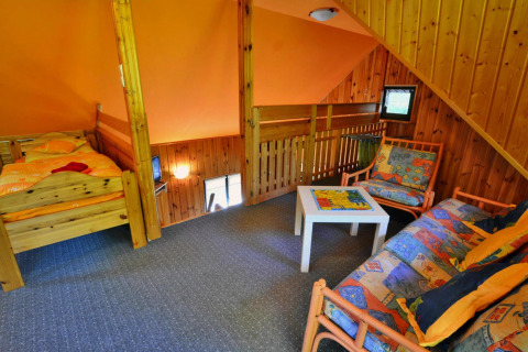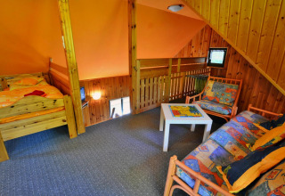 En la planta superior hay un espacio abierto y amplio con una gran cama doble y un rincón de estar adicional, ideal si alguien del grupo quiere un poco más de espacio o un lugar acogedor para relajarse con un libro. Fuera de la temporada de verano, la casa se puede calentar, así que también es una buena opción para unas vacaciones en primavera u otoño junto al mar.