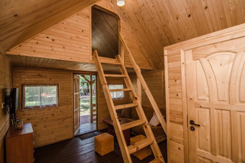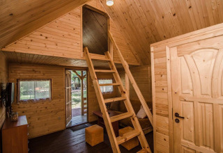 En el altillo encontrarás un acogedor dormitorio doble, ideal para una pareja o padres que buscan un poco de privacidad mientras los niños duermen abajo. La cabaña cuenta con Wi-Fi, y durante los meses más fríos se puede utilizar la calefacción eléctrica (por un cargo adicional), así que siempre te sentirás cómodo.
