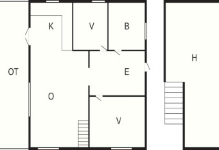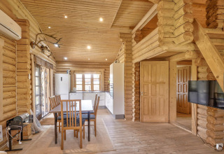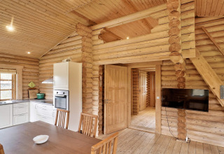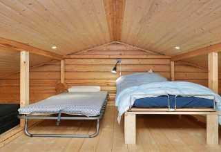 En el interior encontrarás una sala de estar cálida y acogedora con cocina abierta, para que puedas cocinar, conversar y pasar el rato todo en el mismo lugar. Desde aquí, unas escaleras conducen al espacioso altillo de 25 m² con dos plazas adicionales para dormir: un lugar divertido y cómodo para descansar después de un largo día al aire libre. En la planta baja hay un dormitorio con cama doble y otro con dos camas individuales, ofreciéndote combinaciones flexibles para dormir hasta 6 personas.