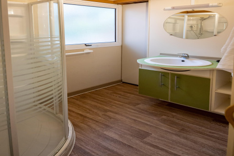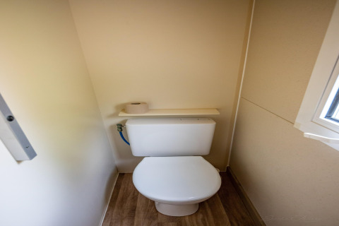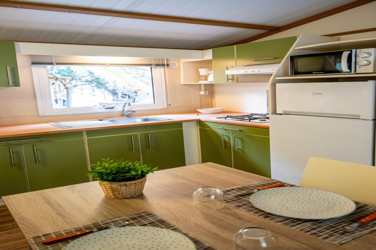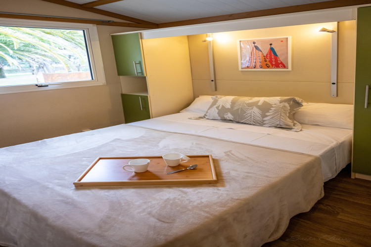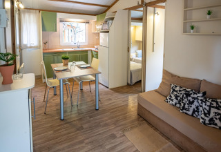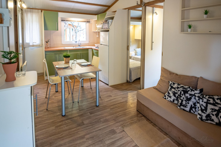 En el interior, encontrarás todo lo necesario para unas vacaciones sin complicaciones. El aire acondicionado mantiene una temperatura agradable, incluso en los días más calurosos de verano; perfecto si te gusta regresar a un espacio fresco después de la playa. La distribución es práctica y social, así que podéis cocinar juntos, relajaros y disfrutar del ambiente relajado de acampada con un toque extra de confort.
