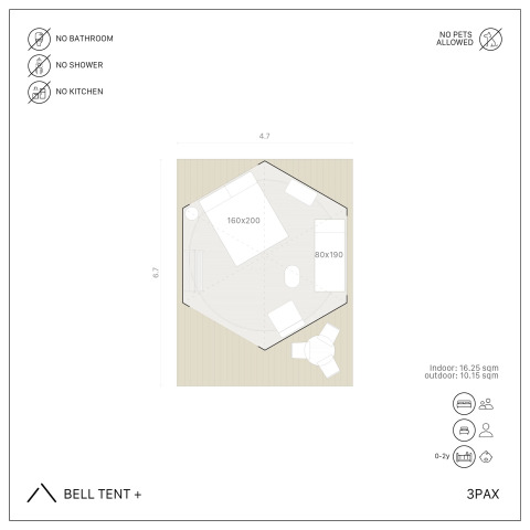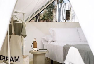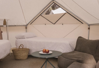 La Bell Tent dispone de una cómoda cama doble y una cama individual; las camas estarán hechas a tu llegada y las toallas también están incluidas. No hay cocina, pero sí una cafetera compatible con cápsulas Nespresso®, un mini-nevera, utensilios de cocina, vajilla y un microondas. La tienda no tiene baño privado, pero los aseos públicos se encuentran a solo unos metros de la tienda. Disfruta de una taza de café preparada por ti mismo en la terraza privada bajo el sol de la mañana.