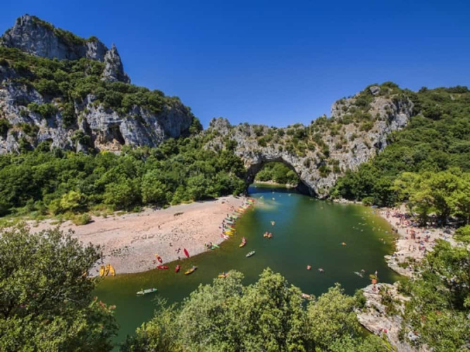 A solo 5 minutos en coche del camping se encuentra Isla Cool Douce, una hermosa playa recreativa a orillas del Ardèche. Con dos playas de arena natural, una de ellas con zona de baño vigilada, es un lugar ideal para familias. Disfruta de las vistas a los impresionantes acantilados del Cirque de Gens mientras nadas, juegas o te relajas junto al agua. Un lugar perfecto para refrescarse en los días calurosos.