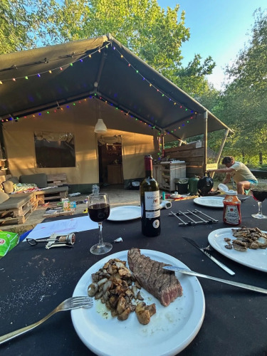 Esta lodgetent ofrece una experiencia glamping cómoda, con la sensación de acampar y la comodidad de un alojamiento completamente equipado. En el interior encontrarás una amplia zona de estar con mesa de comedor y bancos, y una cocina fija con un inventario completo. La cocina está equipada con una cocina de gas de 4 fuegos, una nevera grande y una cafetera Nespresso. En los dormitorios dormirás en colchones boxspring cómodos y la ropa de cama está incluida. Además, la tienda dispone de un baño privado con ducha, inodoro y lavabo, lo que te permite disfrutar de un confort extra durante tu estancia.