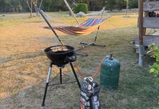 En el exterior disfrutarás de una espaciosa terraza con sofás lounge y sillas reclinables. Aquí podrás relajarte en la hamaca o comer juntos en la mesa exterior. También hay una barbacoa de gas disponible. Gracias a la combinación de baño privado, cocina completa y un amplio espacio exterior, aquí experimentarás la máxima sensación de glamping.