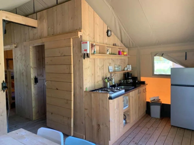 Esta lodgetent para seis personas ofrece una lujosa experiencia de glamping donde se combinan comodidad y acampada. En el interior encontrarás una amplia sala de estar con mesa de comedor y bancos, y una cocina fija con un completo inventario. La cocina está equipada con una cocina de gas de 4 fuegos, una nevera grande y una cafetera Nespresso. En los dormitorios dormirás en cómodos colchones tipo boxspring y la ropa de cama está incluida. Además, la tienda cuenta con un baño privado con ducha, inodoro y lavabo, lo que aporta mayor comodidad durante tu estancia.