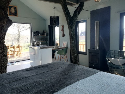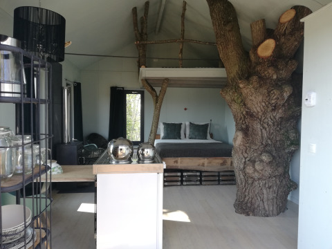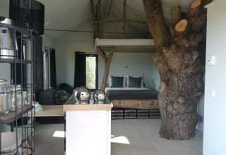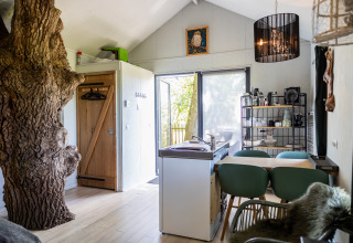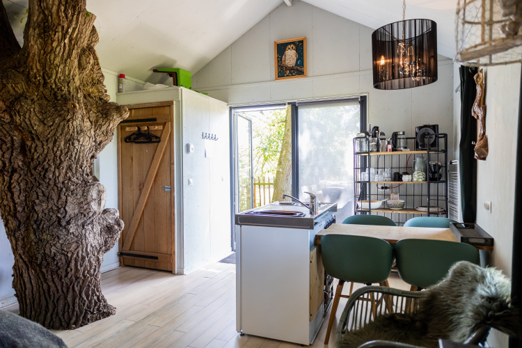 En el centro de la casa del árbol encontrarás una acogedora isla de cocina con una placa eléctrica donde puedes cocinar, comer, jugar un juego o simplemente disfrutar de la compañía. Cuando hace más frío fuera, la estufa de leña aporta calor y ambiente acogedor.