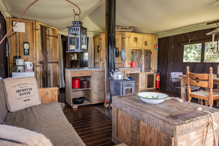Dormir en una tienda espaciosa para seis personas, rodeado de naturaleza y comodidad. Agua corriente fría, un retrete propio, lámparas de aceite y velas aseguran confort y atmósfera. Cocina dentro en la estufa de madera o afuera en la estufa que también funciona como barbacoa. Con nevera, cafetera y utensilios de cocina, todo está disponible. Cerca del estanque para nadar y pescar, pero todavía en un ambiente muy tranquilo.