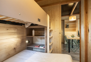 La casa móvil cuenta con una agradable zona de comedor y una cocina con todo lo esencial, como cocina de gas, microondas y frigorífico. Hay dos dormitorios: uno con cama de matrimonio de 140 cm y otro con cama de matrimonio de 140 cm abajo y una cama individual de 90 cm arriba. El cuarto de baño tiene lavabo, cabina de ducha e inodoro.