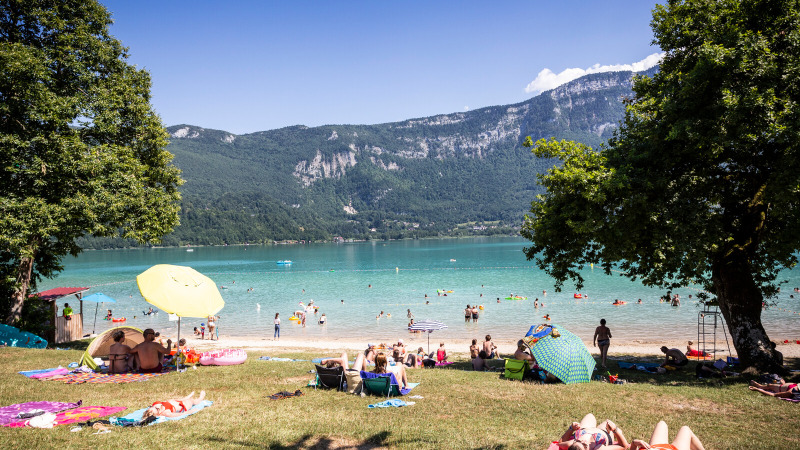 Camina hasta la playa de Sougey (200 m) para bañarte en las aguas esmeralda del lago Aiguebelette