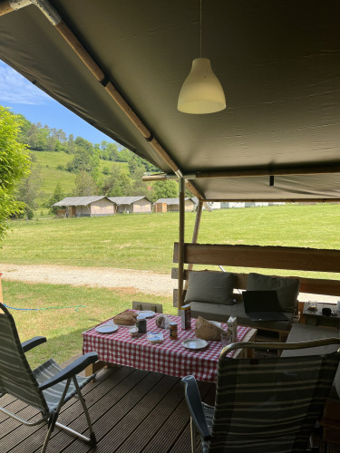 En la veranda puedes relajarte en dos sofás lounge o en la hamaca. En la parcela de camping hay también una mesa de comedor de madera con bancos y dos sillas de camping reclinables. Además, hay una barbacoa de gas disponible. Gracias a la amplia veranda y a las instalaciones exteriores, la vida al aire libre es el centro aquí.