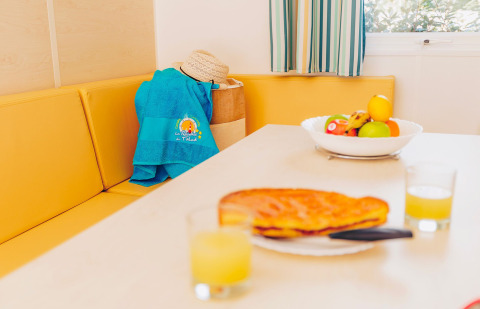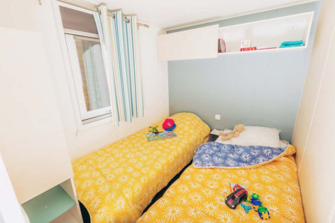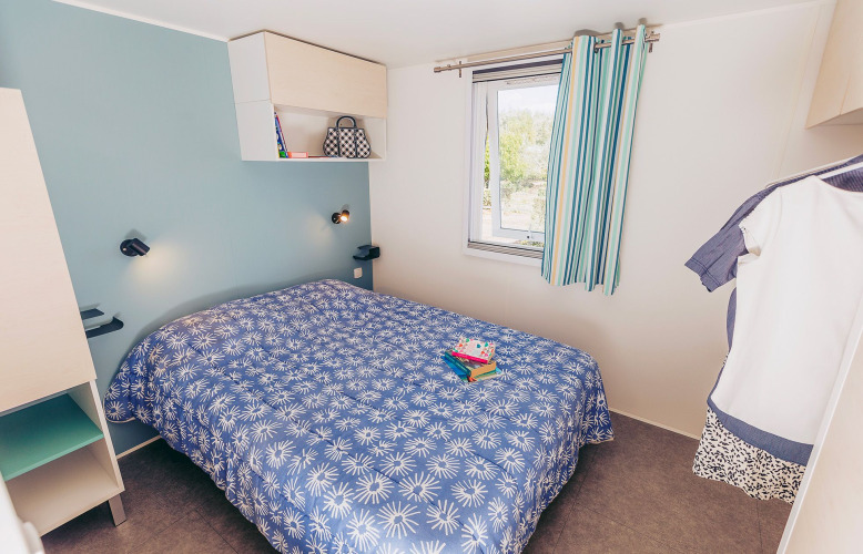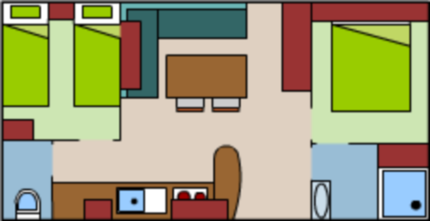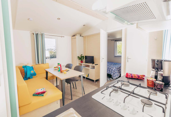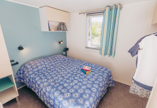 La Stacaravan Comfort BAHIA es un alojamiento ideal para familias que desean disfrutar de una estancia confortable en un entorno cálido y moderno. Diseñada para un máximo de cuatro personas, dispone de dos dormitorios bien distribuidos: uno con una cama doble (140 x 190 cm) y un armario, y el segundo con dos camas individuales (80 x 190 cm) y su propio espacio de almacenamiento.