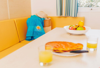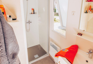 La luminosa sala de estar se conecta con una cocina totalmente equipada con cuatro quemadores de gas, un frigorífico-congelador, microondas y cafetera, lo que permite preparar fácilmente las comidas diarias. También hay una televisión disponible para momentos de relax. La stacaravan dispone de un baño funcional con ducha y un aseo independiente.