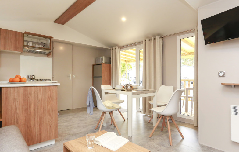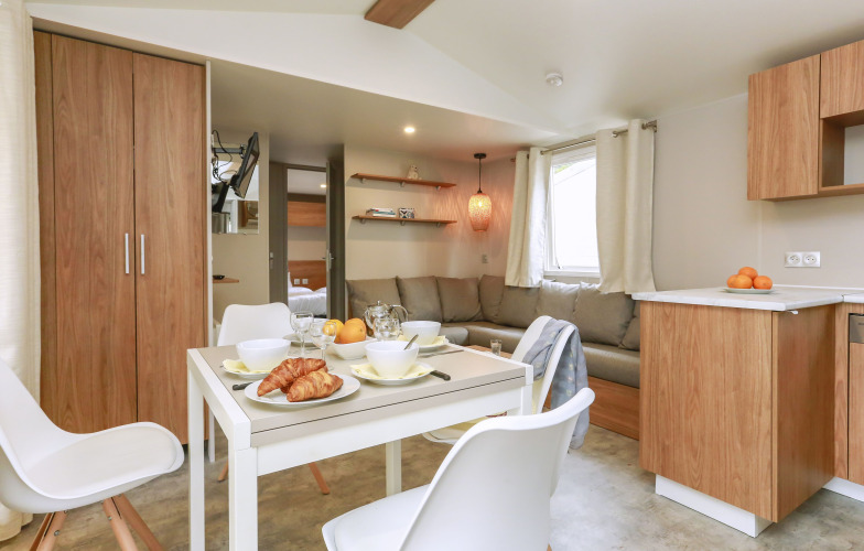 Experimenta la máxima sensación al aire libre sin renunciar al lujo en esta Stacaravan Premium de 40 m² en Erquy. Ven con tu familia o amigos y disfruta de amplitud, comodidad y privacidad gracias a dos elegantes dormitorios y dos modernos baños. La cocina está totalmente equipada, incluyendo un horno, perfecta para preparar tus propios dulces. En el interior te espera un ambiente cálido y contemporáneo con televisión y un interiorismo cuidadosamente diseñado. En el exterior, la gran terraza invita a largas veladas bajo las estrellas. Ubicada en el corazón de Bretaña, este lugar combina tranquilidad y naturaleza con todo lo que hace especial a una experiencia de glamping moderna. Aquí surge esa rara mezcla de relajación y convivencia que convierte las vacaciones en algo inolvidable.
