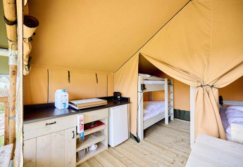 En Les Bois du Bardelet, puedes acampar en Villatent Nomad. Esta tienda safari para 6 personas está totalmente equipada con cocina y baño.