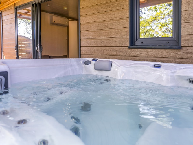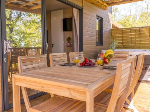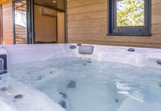 En el exterior hay una gran terraza cubierta de 26 m² con mobiliario de jardín cómodo, perfecta para largas veladas de verano. En esta terraza cubierta encontrarás un jacuzzi privado para cinco personas donde podrás relajarte a gusto.