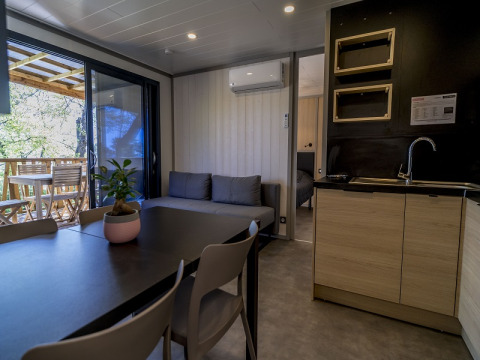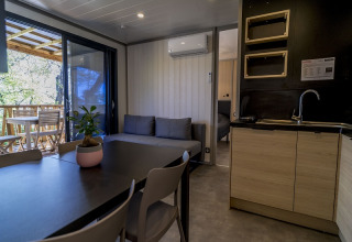 El lodge es espacioso y perfecto para familias. Gracias a su ubicación elevada, tendrás vistas sobre los árboles y el mar de fondo. El interior es cálido y cómodo, con una decoración moderna y todas las comodidades que harán tu estancia aún más especial.