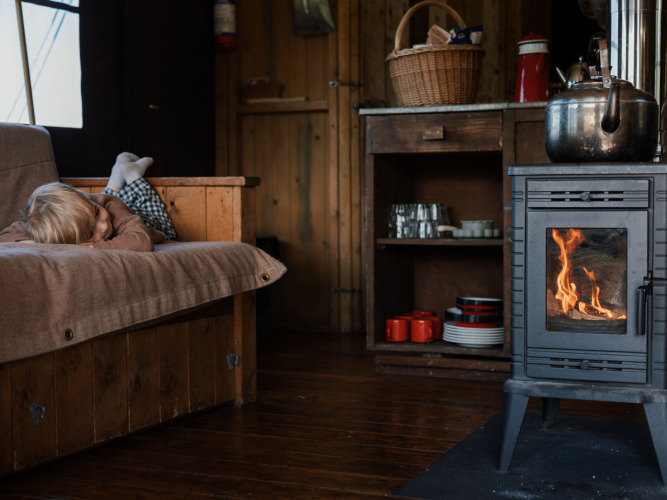 ¿Sin electricidad? ¡Eso es lo que la hace más especial! La tienda está atractivamente iluminada con lámparas de aceite y velas, y se cocina en la estufa de leña. Hay troncos listos para hacerla agradable, cálida y acogedora. ¿Te atreves?