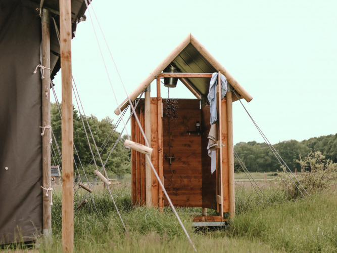 Nada de duchas compartidas, sólo tu propia ducha privada con agua caliente justo al lado de tu tienda. Además, la casa de campaña tiene un inodoro con cisterna de verdad, muy agradable durante tu estancia en la naturaleza.