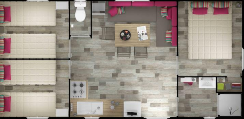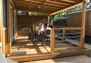 Disfruta de unas vacaciones acogedoras en esta premium houten stacaravan de 33 m² con aire acondicionado, perfecta para un máximo de seis personas. Relájate en tres dormitorios confortables y una amplia sala de estar con zona de comedor y televisión para momentos de descanso. La cocina completamente equipada hace que cocinar sea sencillo, como en casa. En el exterior te espera la terraza de madera semi-cubierta con muebles de jardín, ideal para cenar al aire libre o pasar una tranquila velada en la naturaleza. Las sábanas y toallas ya están preparadas, lo que te permite viajar ligero y empezar a disfrutar de inmediato.